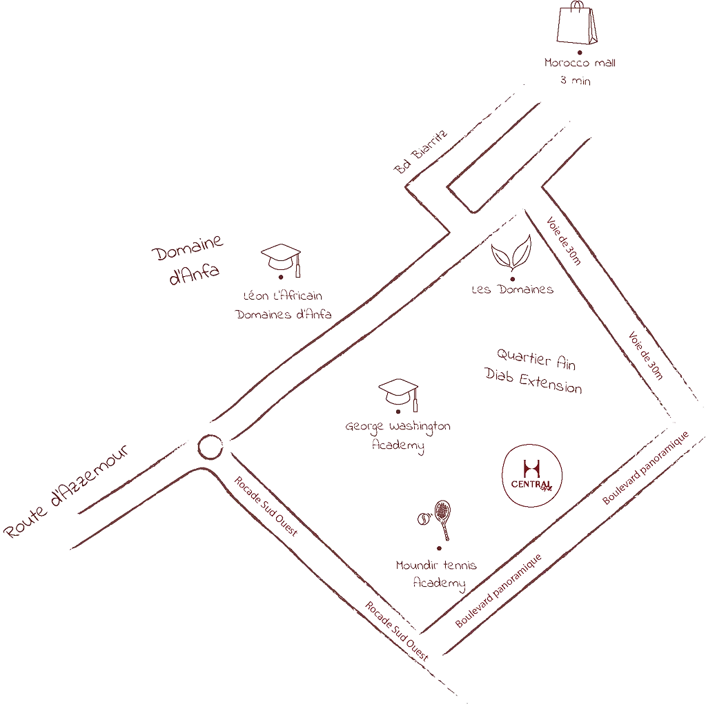 Situé à Ain Diab Extension, le long de la nouvelle voie panoramique, Central Hills se dresse comme un nouvel emblème de la vie contemporaine, offrant une belle perspective sur l’océan depuis son emplacement dominant l‘horizon. À quelques minutes des écoles réputées, des commerces et des services essentiels, Central Hills représente le choix idéal pour une vie quotidienne pratique et agréable, dans un emplacement central, accessible et stratégique.